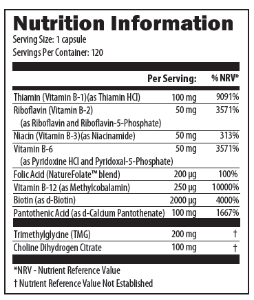 This very powerful B vitamin combination formula supplies most of the B vitamins in their coenzymated forms, so the body does not have to phosphorylate them in order to be used in biochemical reactions. This formula also includes TMG and choline to support methylation.