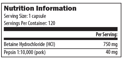 Betaine HCl provides 750 mg betaine hydrochloride along with pepsin, a key protein digestive enzyme produced in the stomach. This product is ideal for those who are looking to support their stomachs digestive function. Taking one capsule before a meal aids digestion, especially the digestion of protein-containing foods, and helps with the assimilation of nutrients.