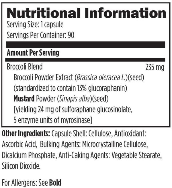 This product is a synergistic blend of specially cultivated broccoli seed extract and brocolli sprout concentrate. It is also designed to help support detoxification, antioxidant status and cellular health, as well as offer cardiovascular and neuronal support.
