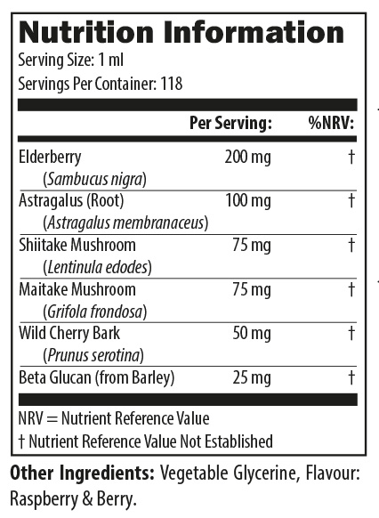 ImmunoBerry™ Liquid provides immune support in a pleasant tasting liquid. Research suggests that certain herbs, mushrooms and other natural compounds have the ability to support normal immune functions such as natural killer (NK) cell activity, cytokine synthesis and the T-cell and B-cell mediated responses. The ingredients such as Elderberry, Shiitake and Wild Cherry Bark are known for their beneficial effects for maintaining a healthy immune system. ImmunoBerry™ Liquid is sweetened with glycerine and tastes great, and is ideal for both children and adults.