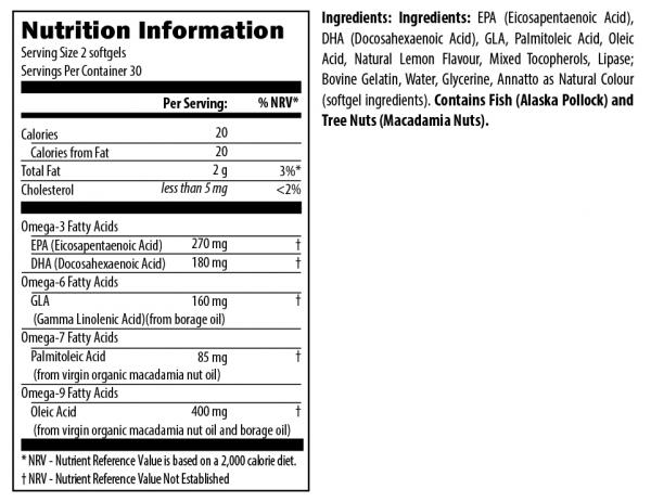This unique omega 3-6-7-9 formula contains a blend of wild deep-sea sourced fish oils containing the omega-3 fats (EPA/DHA) in the TruTG™ form, the most important omega-6 fat (GLA from borage oil), the omega-7 fat palmitoleic acid and omega-9 fat oleic acid from certified virgin organic macadamia nut oil. EPA helps keep GLA metabolism in an anti-inflammatory mode. In addition, docosahexaenoic acid (DHA) plays as many important roles in human health as EPA, along with promoting brain wellness.