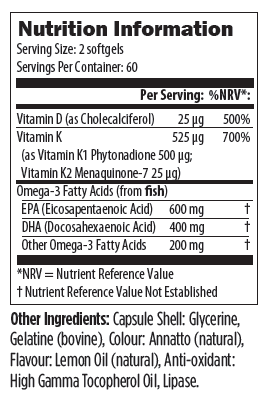 An Omega 3 fish oil formula from Alaskan Pollock with vitamins D3, K1 and K2 to help support cardiovascular, bone and immune health. Lipase is added to enhance the digestibility, absorption and prevent ‘repeating’. Mixed tocotrienols (antioxidants) are added to enhance the stability of the product.