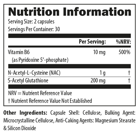 This product also includes N-acetyl-cysteine (NAC) and vitamin B6, both of which are important for the production of glutathione.