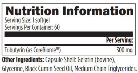 Tri-Butyrin Supreme™ represents a new approach to gut health and immune function by modulating intestinal flora, promoting colonocyte health, and supporting proper gut permeability.* This product features CoreBiome™, a patent-pending form of tri-butyrin, consisting of three molecules of butyric acid (butyrate) bound to glycerol.